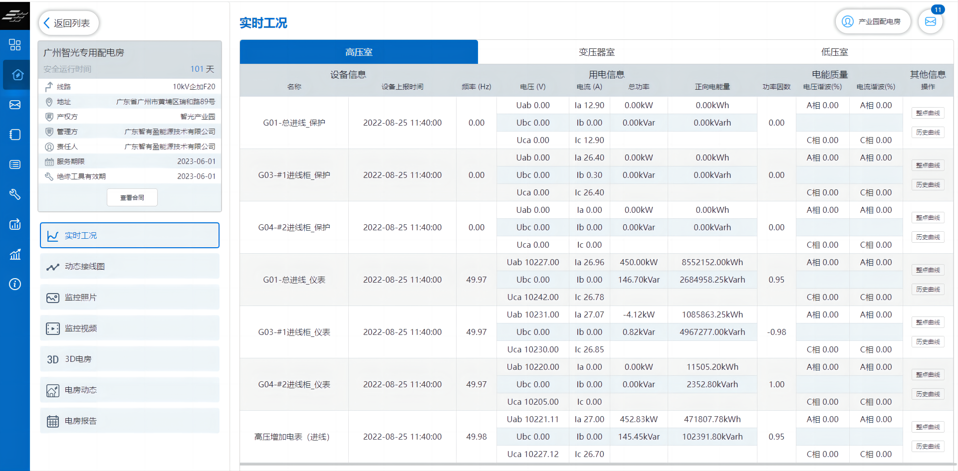 通過設(shè)備列表、動態(tài)接線圖等界面查看饋線及用電設(shè)備的實(shí)時(shí)運(yùn)行狀況、歷史數(shù)據(jù)、監(jiān)控照片、監(jiān)控視頻等。用電數(shù)據(jù)不僅包括了常用的電壓、電流、功率、用電量等數(shù)據(jù),還能查看到諸如有功需量、諧波含量等與經(jīng)濟(jì)用電、電能質(zhì)量水平相關(guān)的數(shù)據(jù)項(xiàng)目。